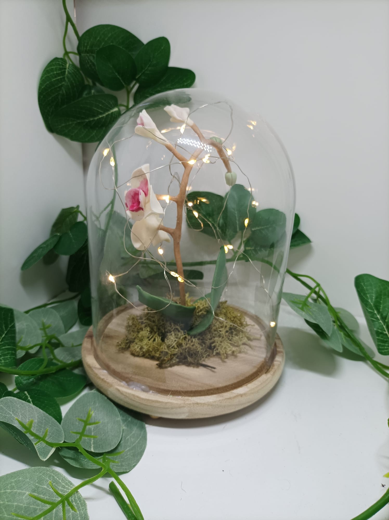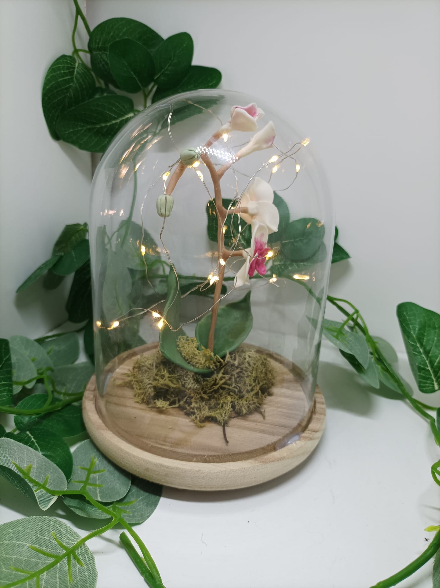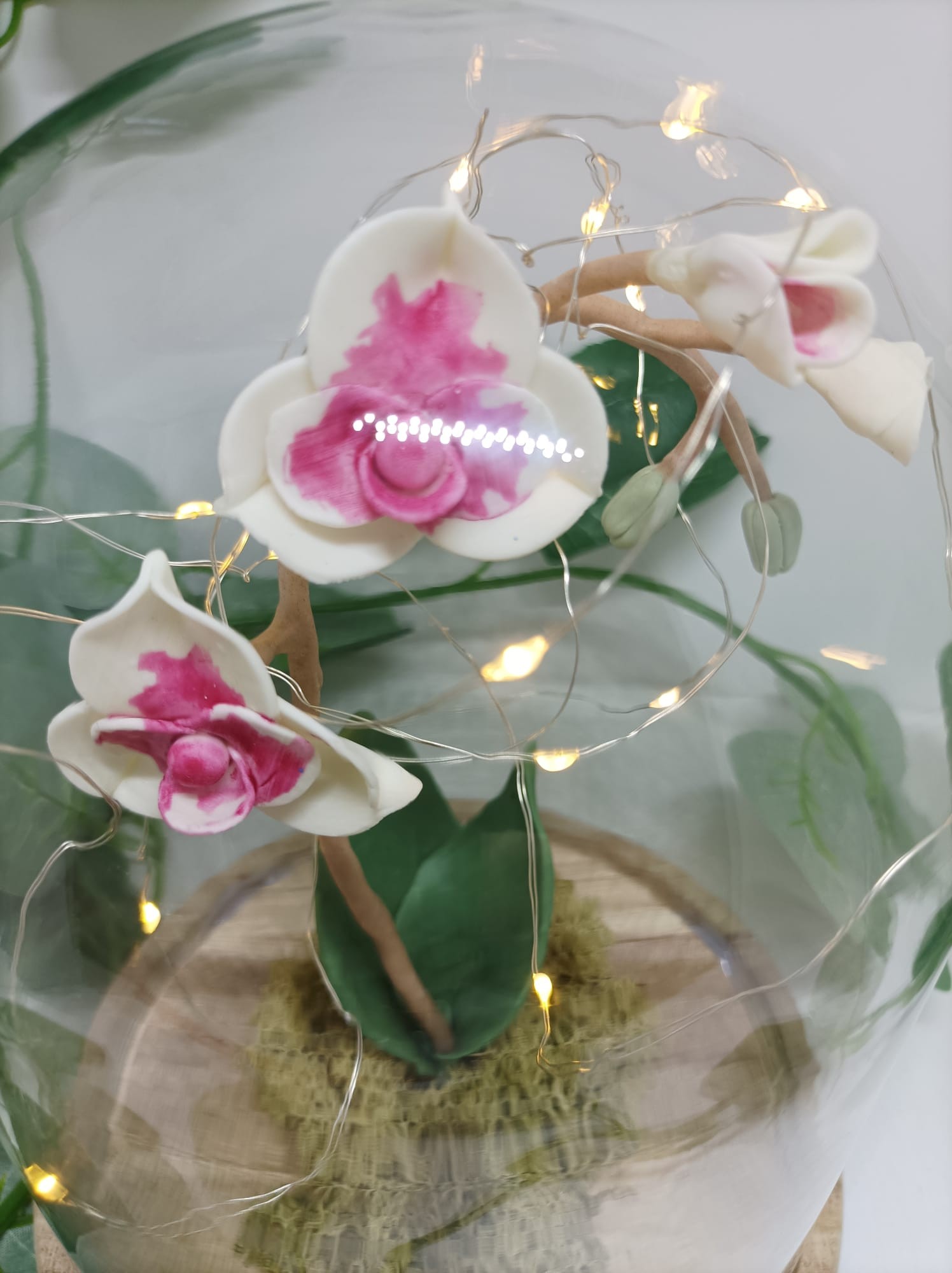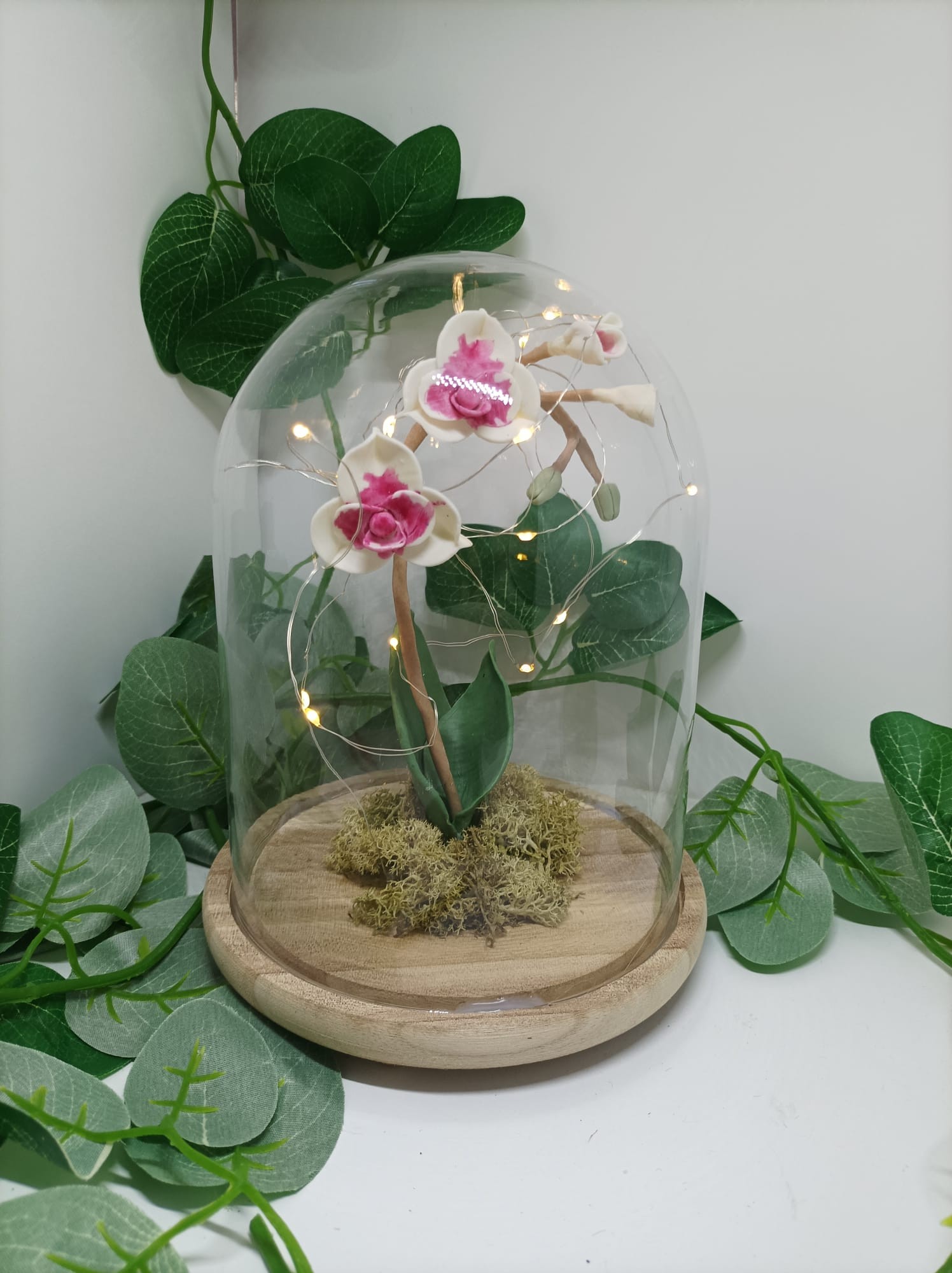 Orchidées modelées à la main en porcelaine froide sous cloche en verre avec guirlande Led.