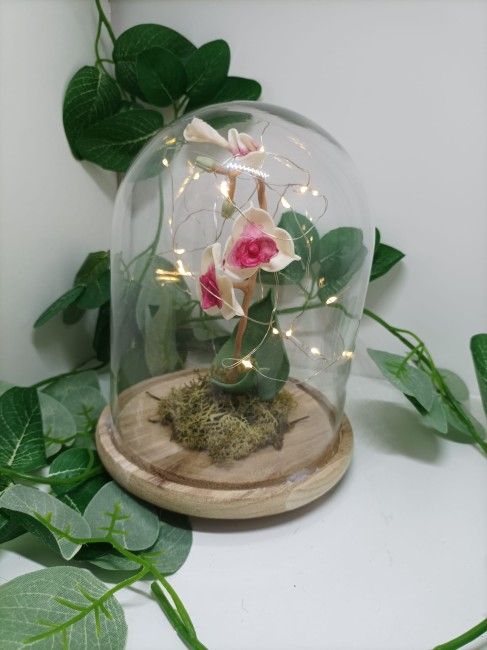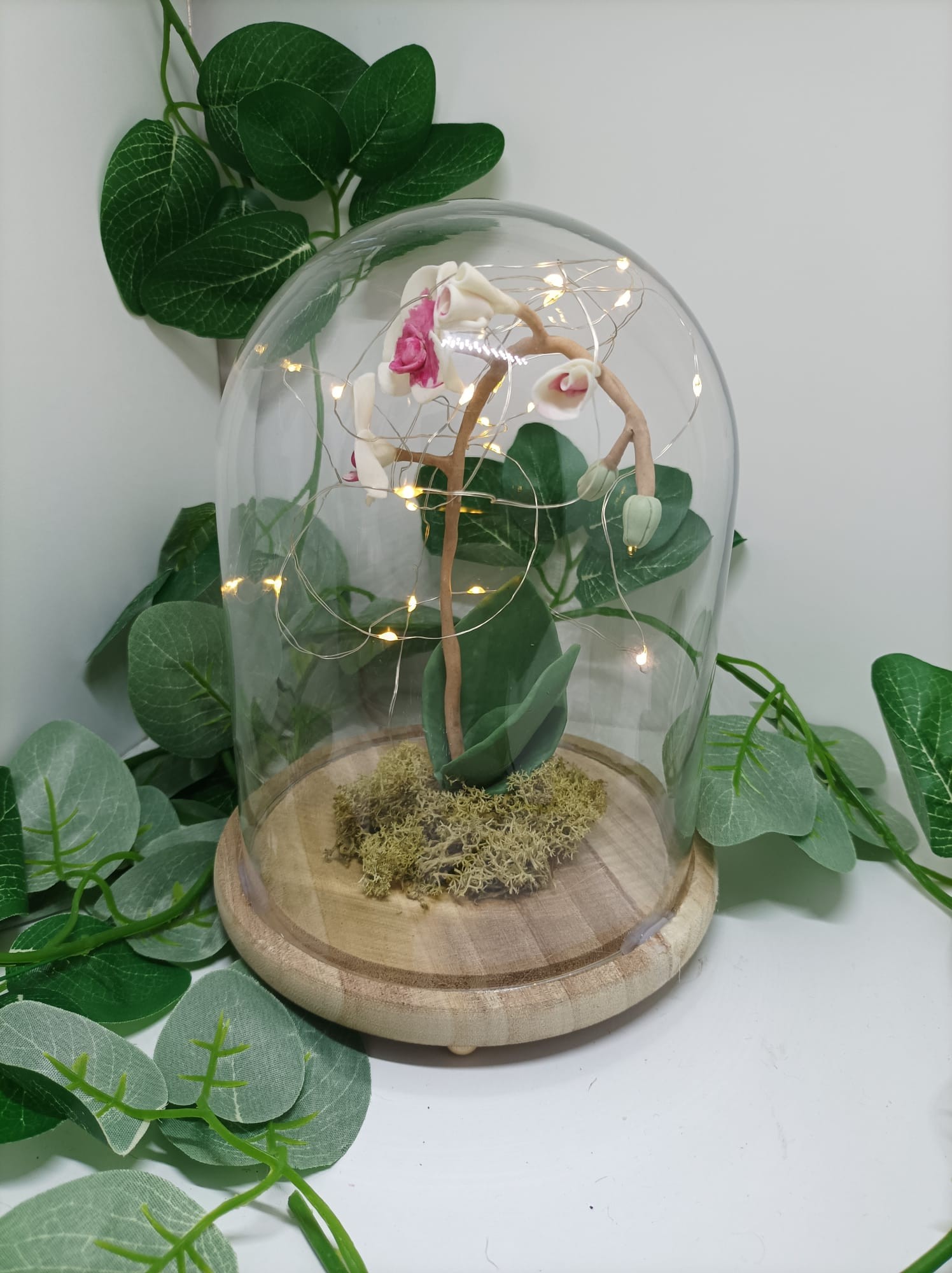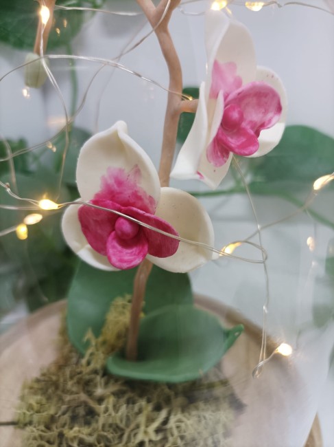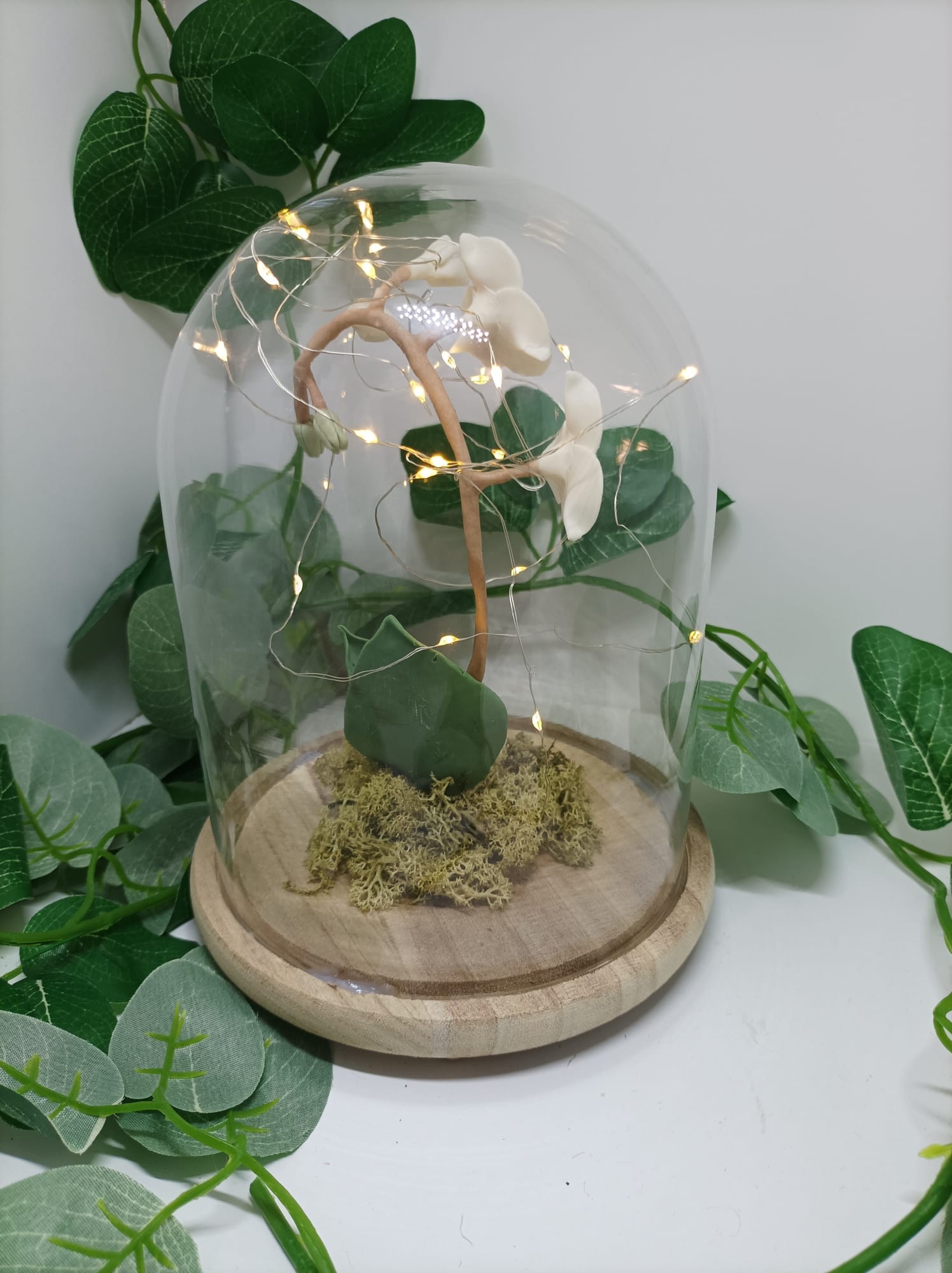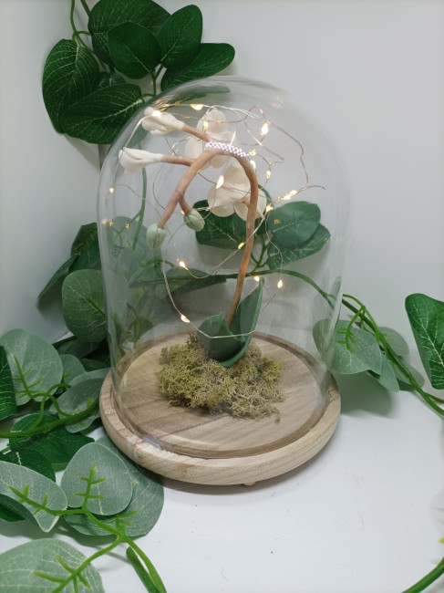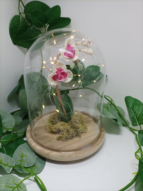 Orchidées modelées à la main en porcelaine froide sous cloche en verre avec guirlande Led.