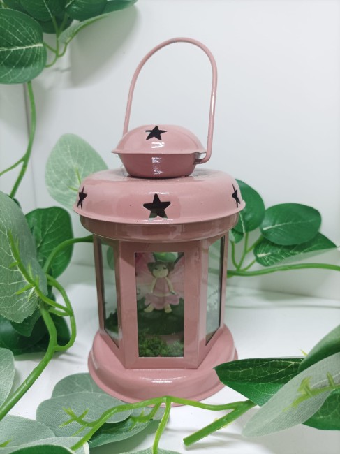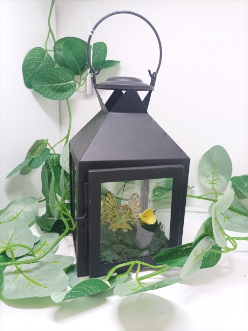 Lanterne noire avec une fée bleue et des fleurs modelées à la main en porcelaine froide.