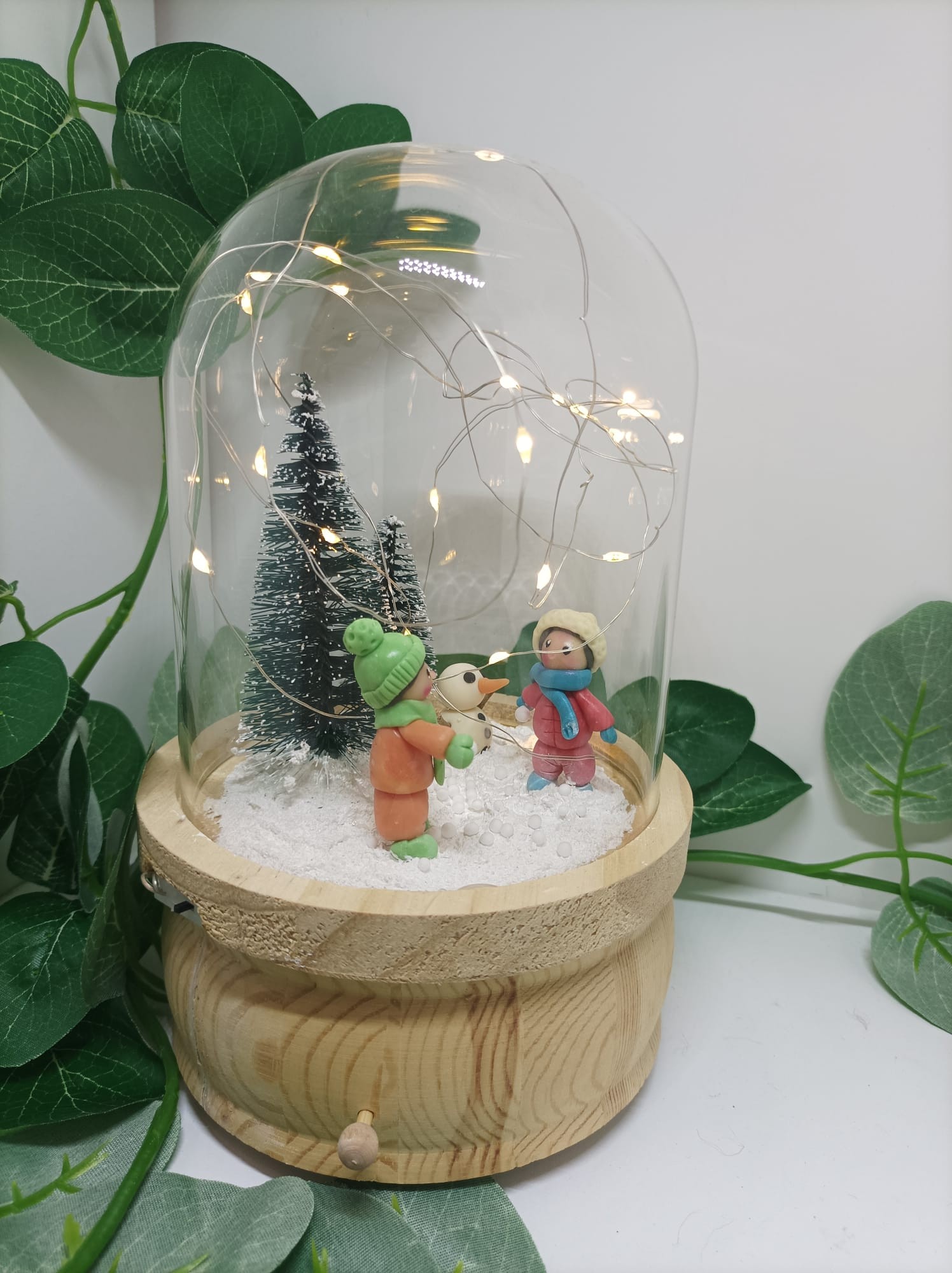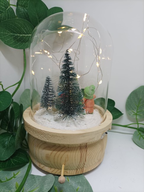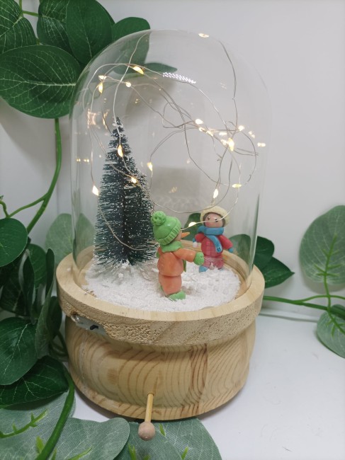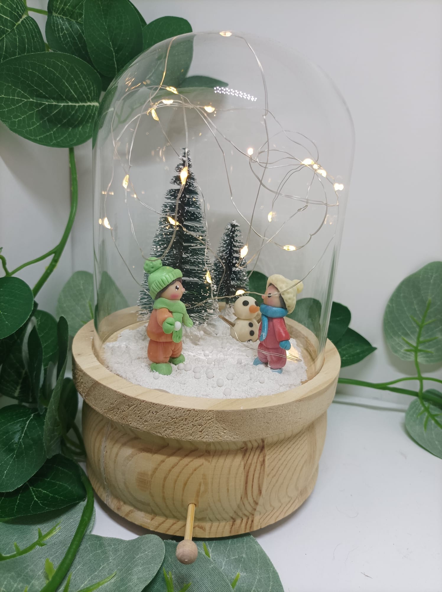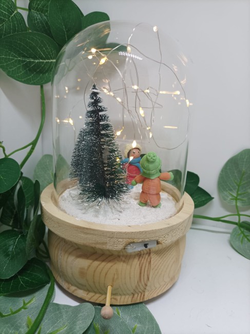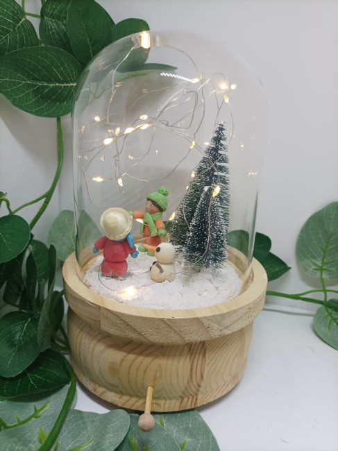 Boite à musique avec une scène de Noël modelées à la main en porcelaine froide sous cloche en verre avec guirlande Led.