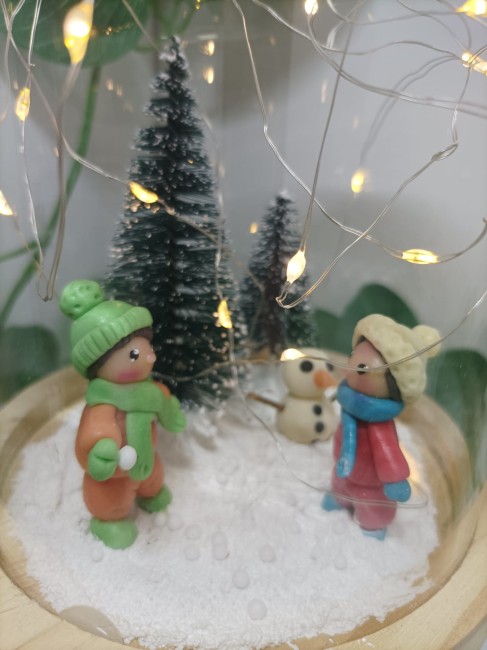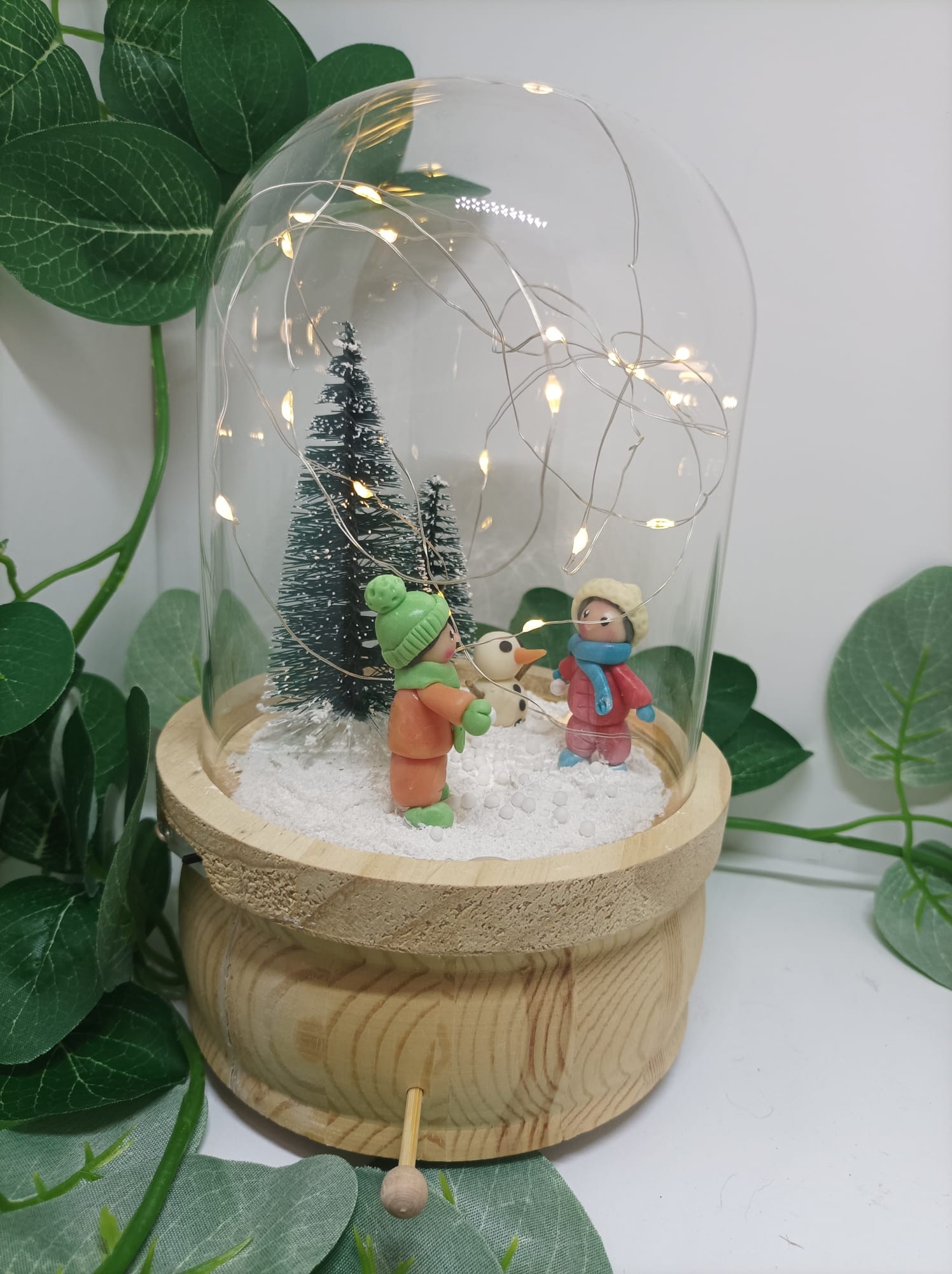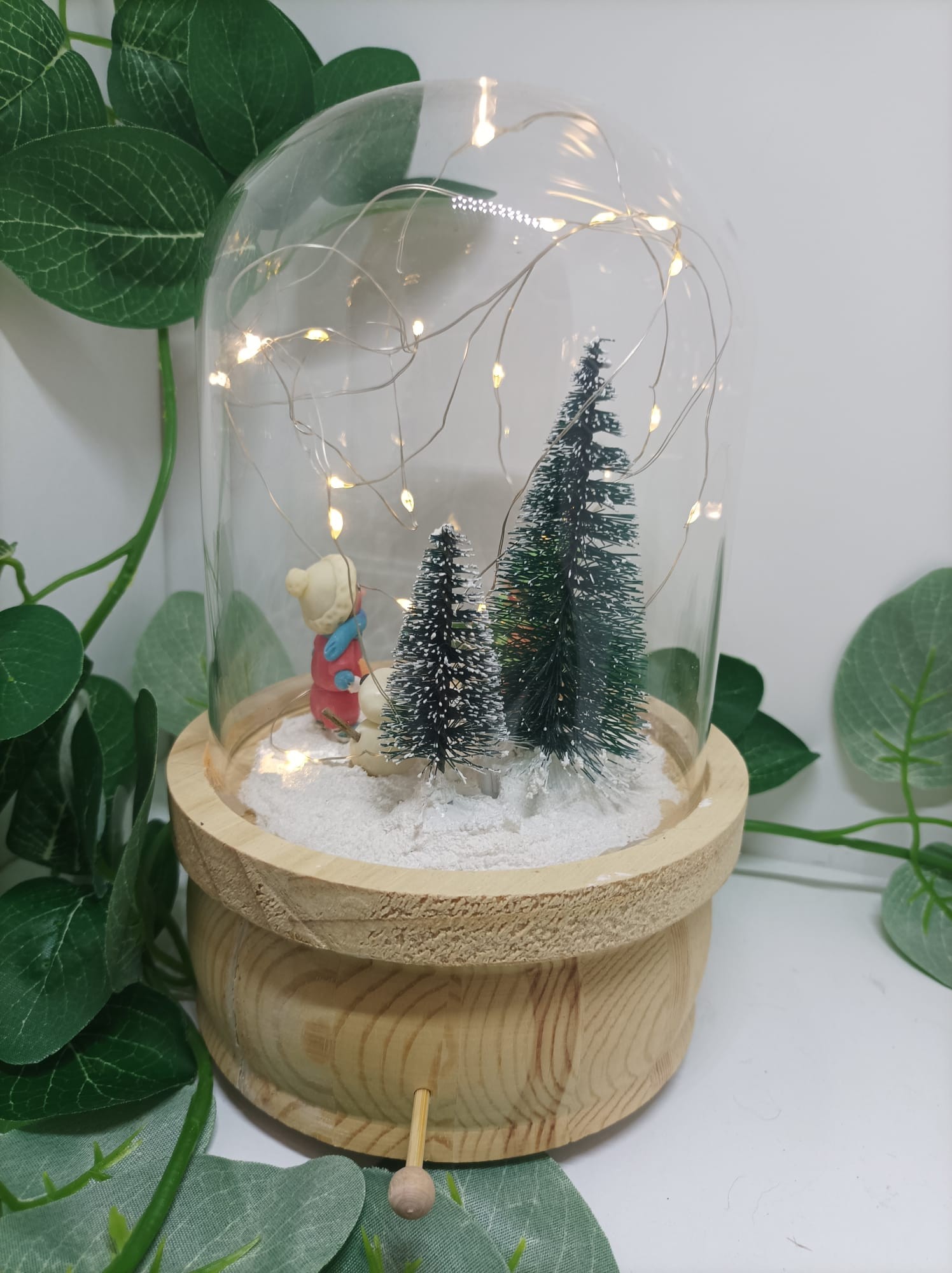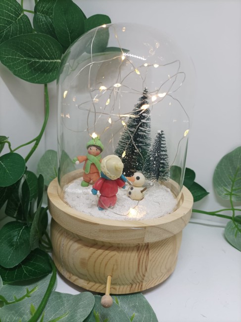 Boite à musique avec une scène de Noël modelées à la main en porcelaine froide sous cloche en verre avec guirlande Led.
