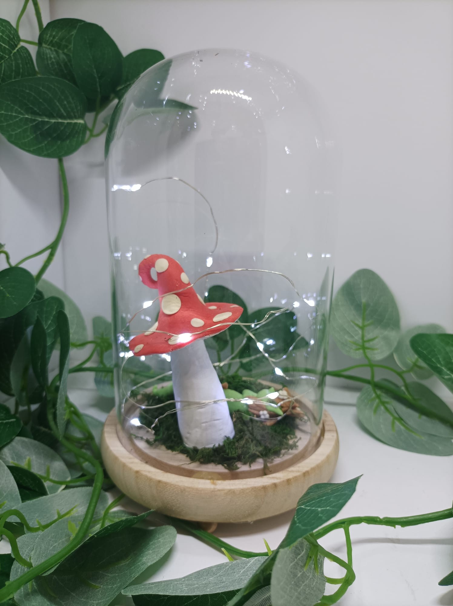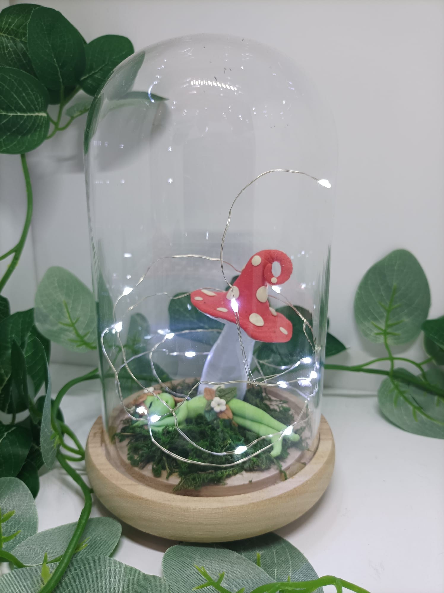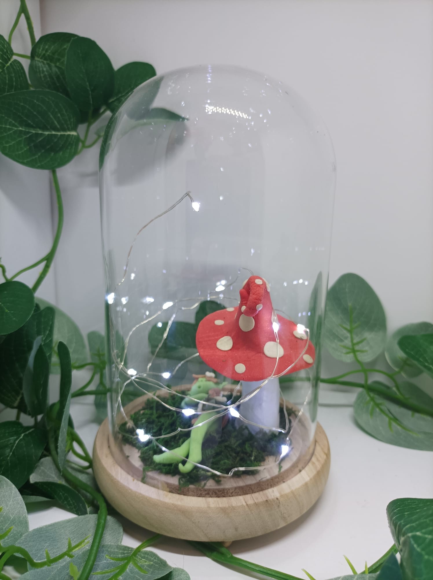 Elfe et son champignon modelé à la main en porcelaine froide sous cloche avec guirlande LED.