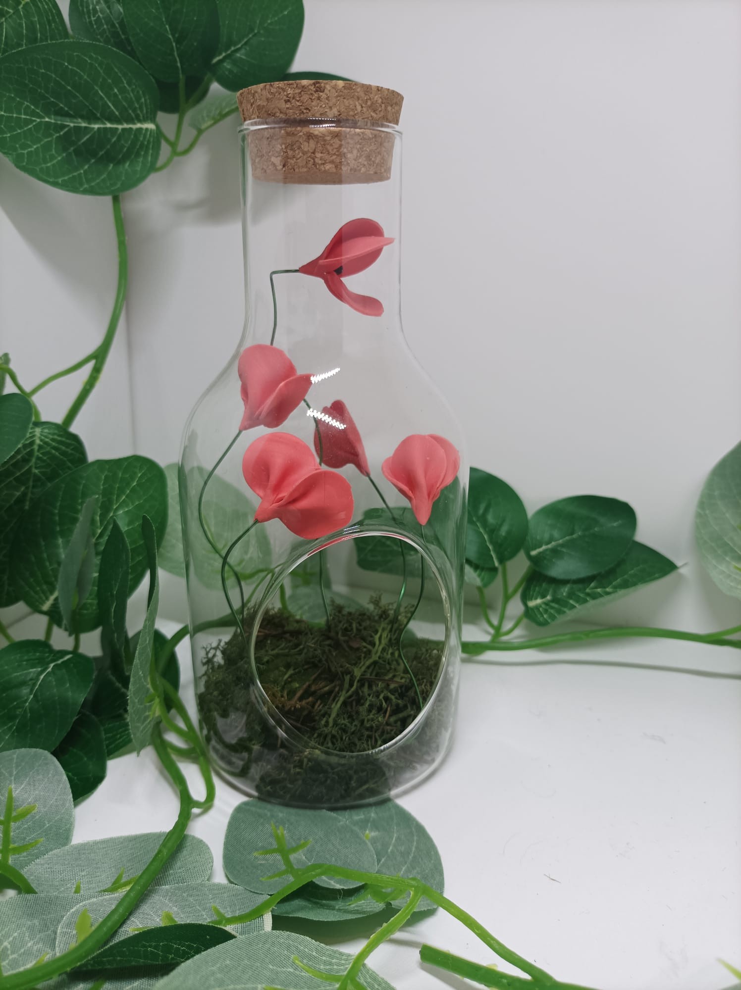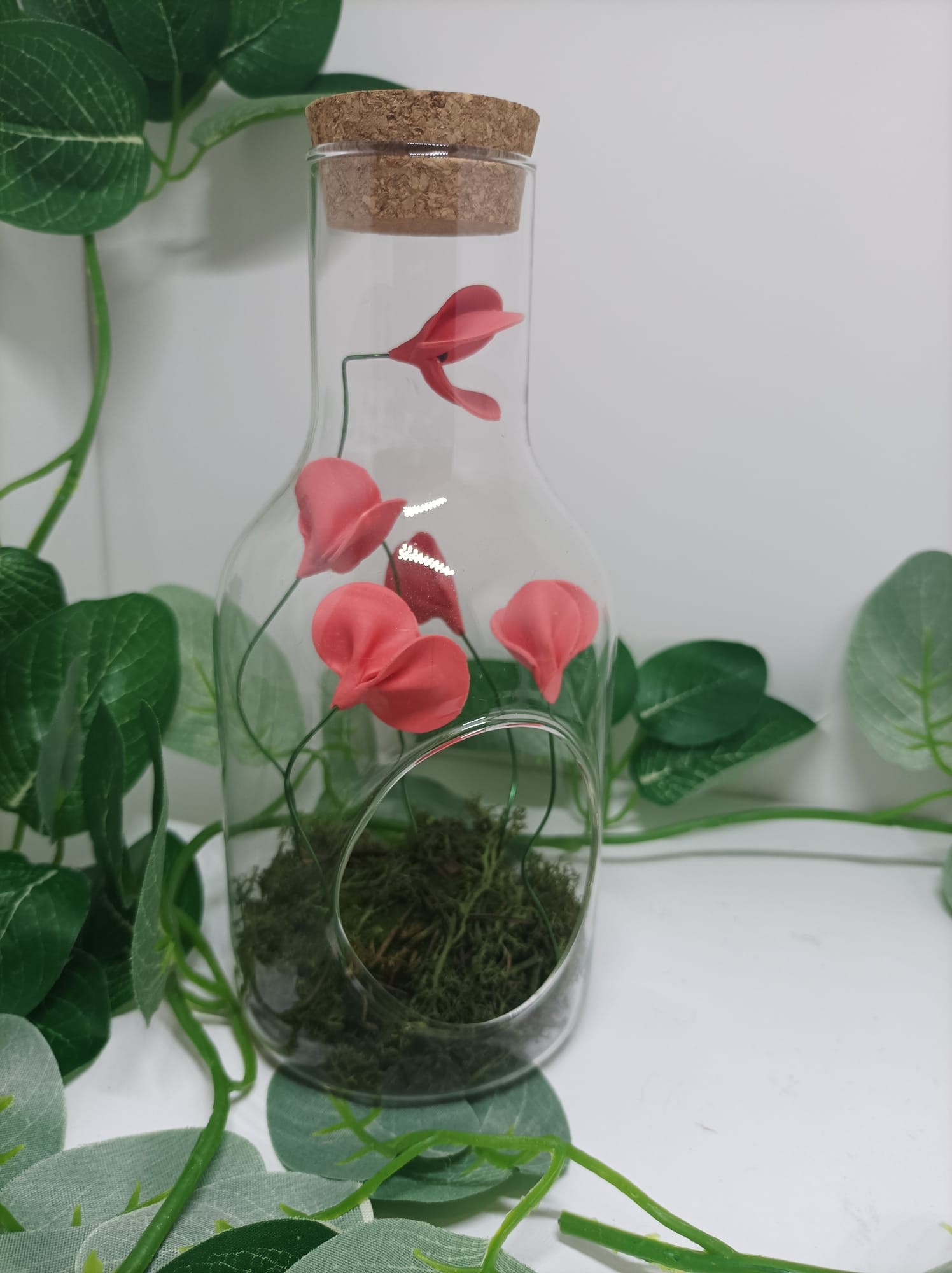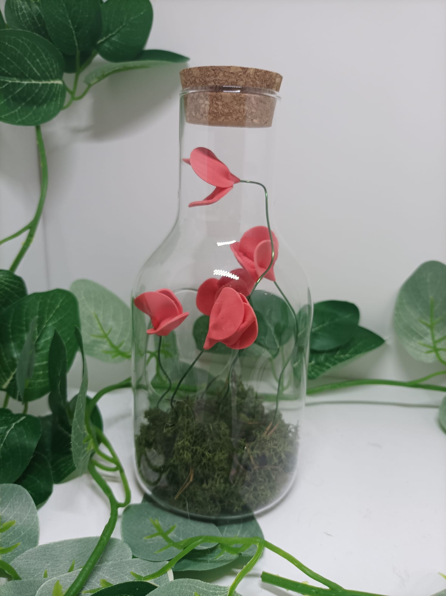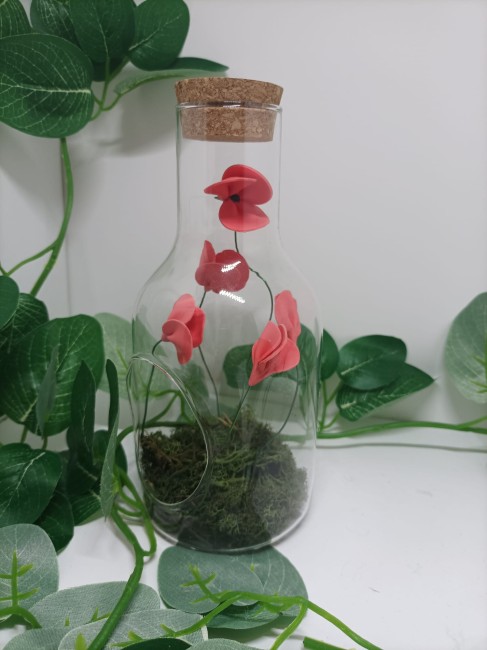 Vase en forme de bouteille avec des coquelicots modelés à la main en porcelaine froide.