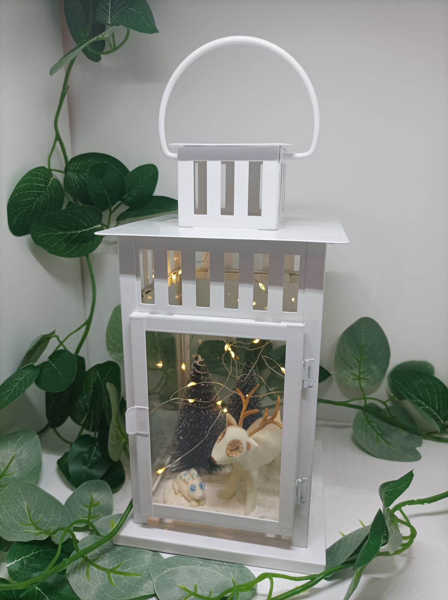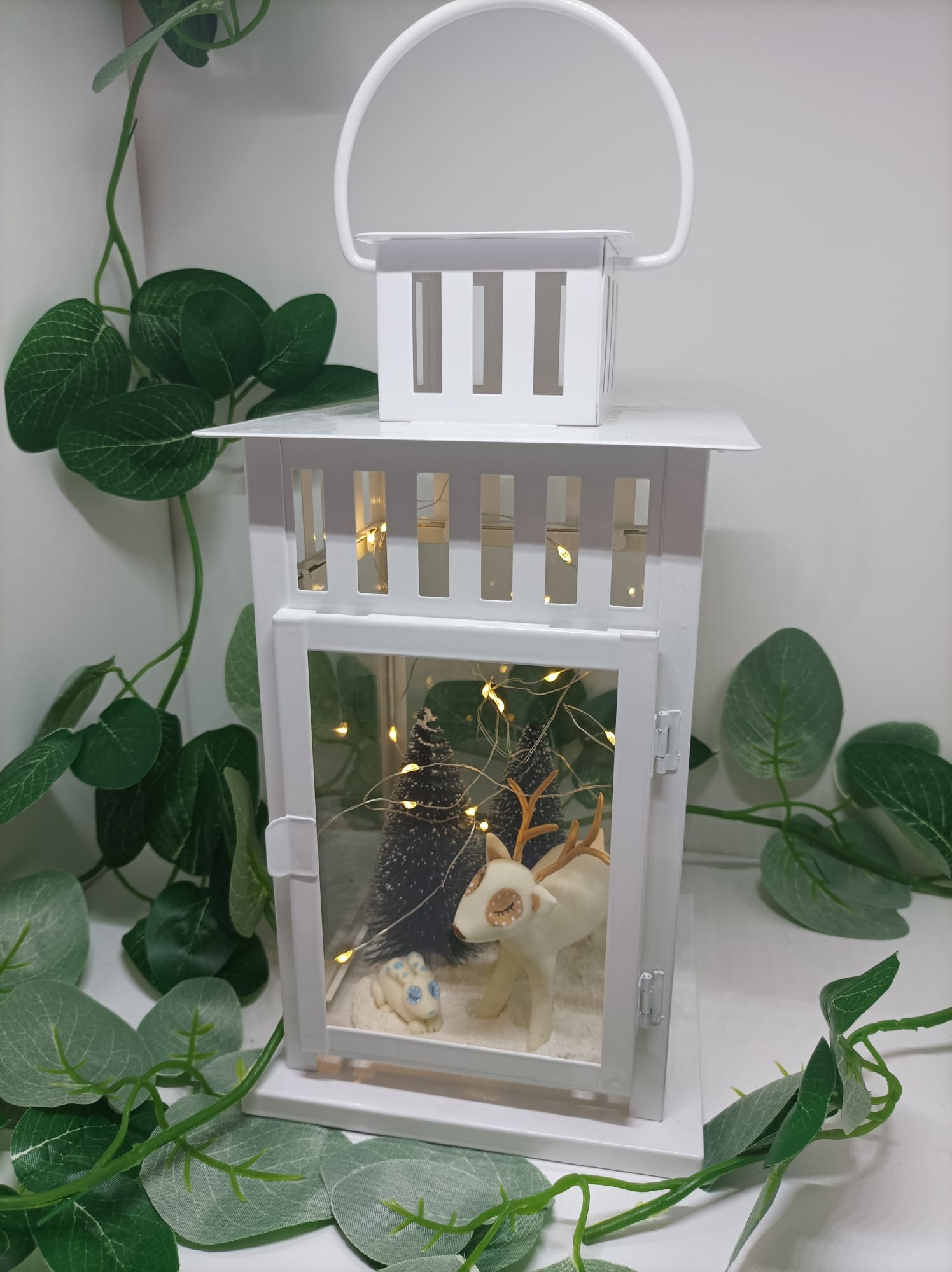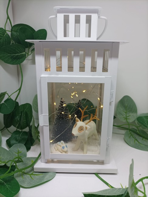 Lanterne blanche avec un cerf et un lapin modelés à la main en porcelaine froide, agrémentée d'une guirlande LED à piles boutons avec un interrupteur.