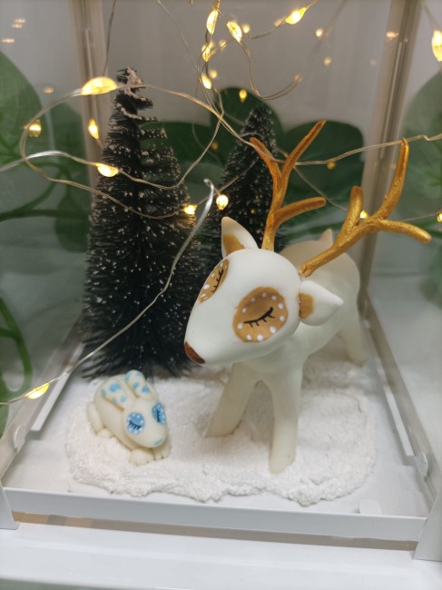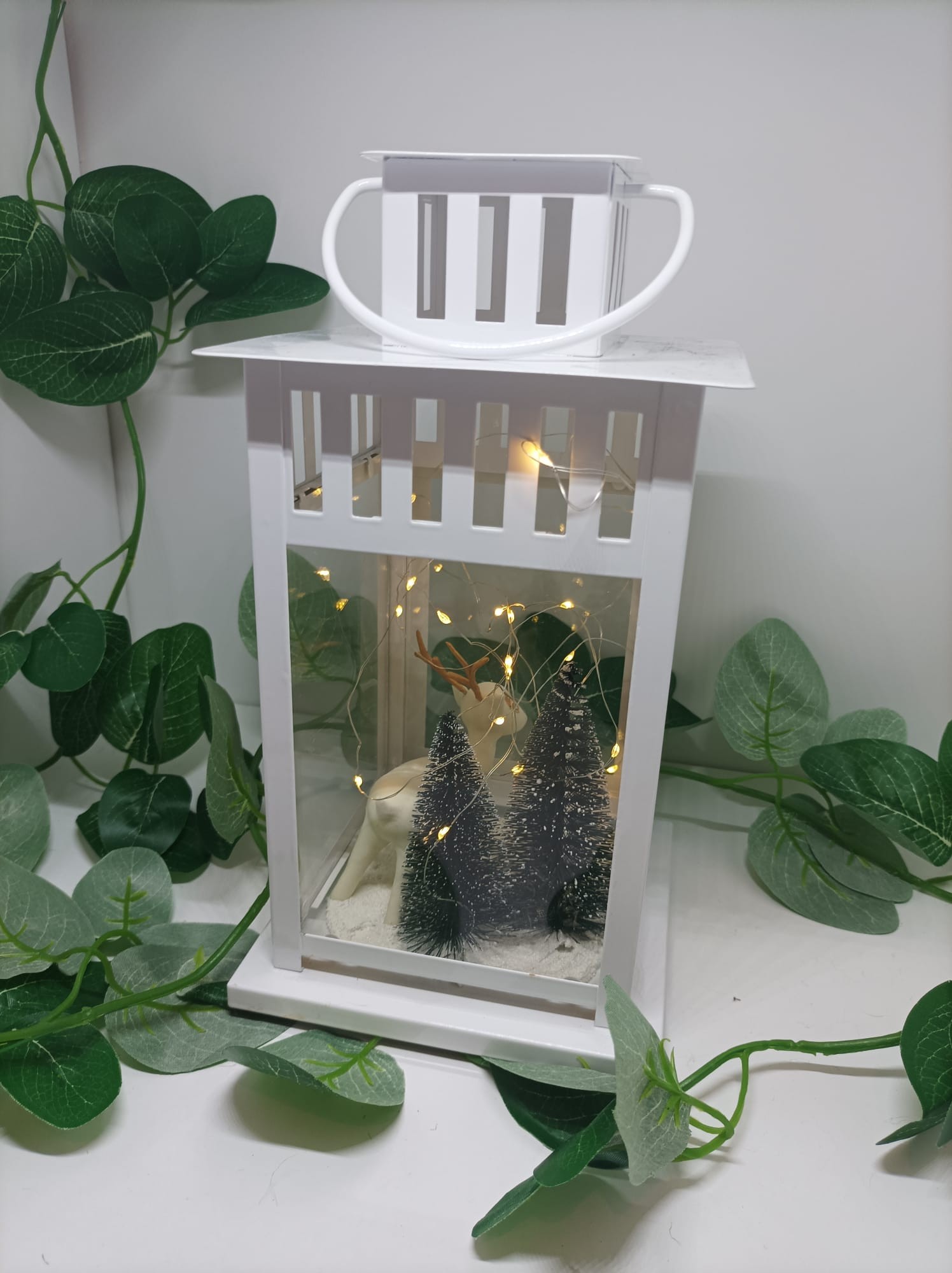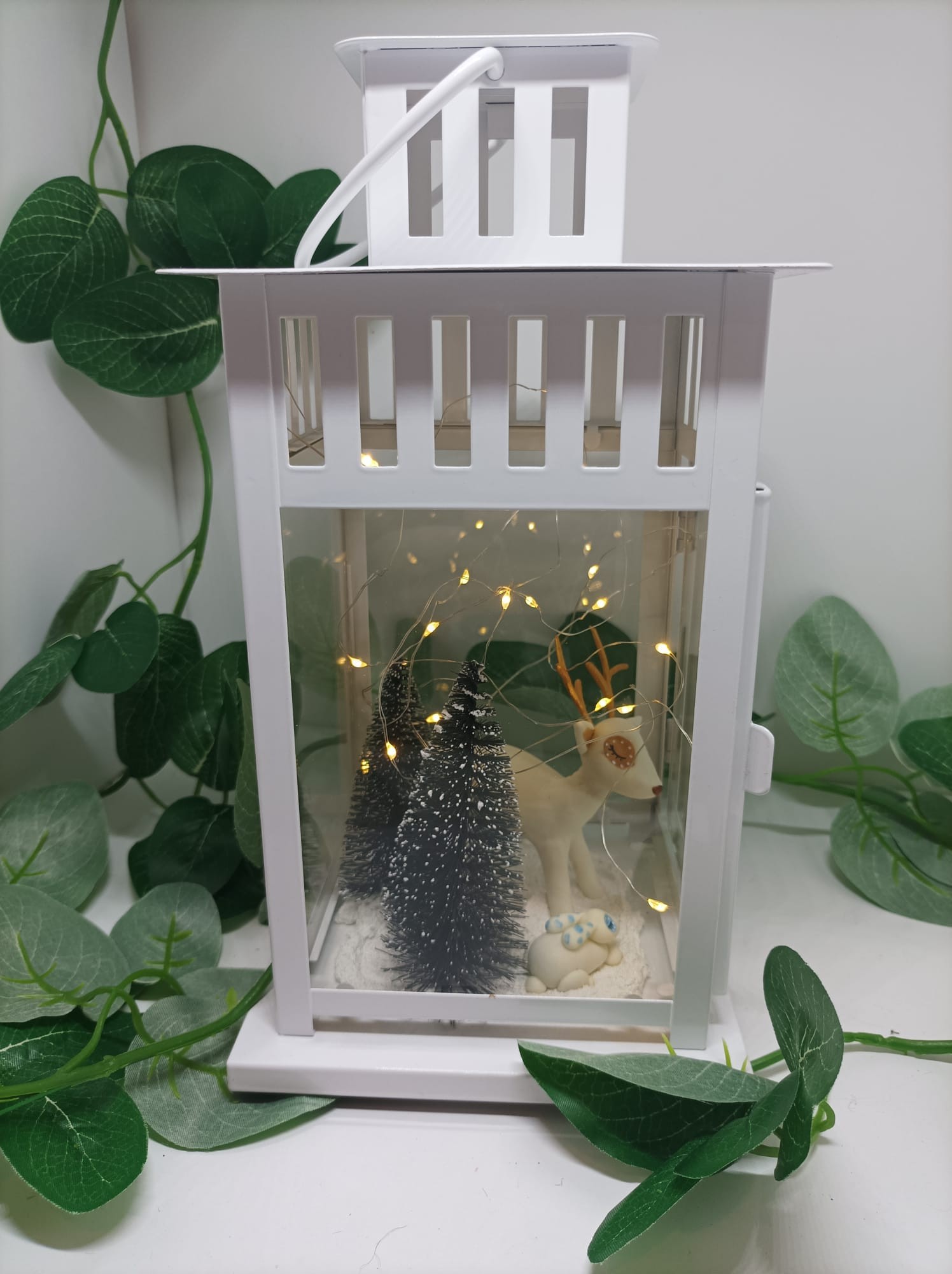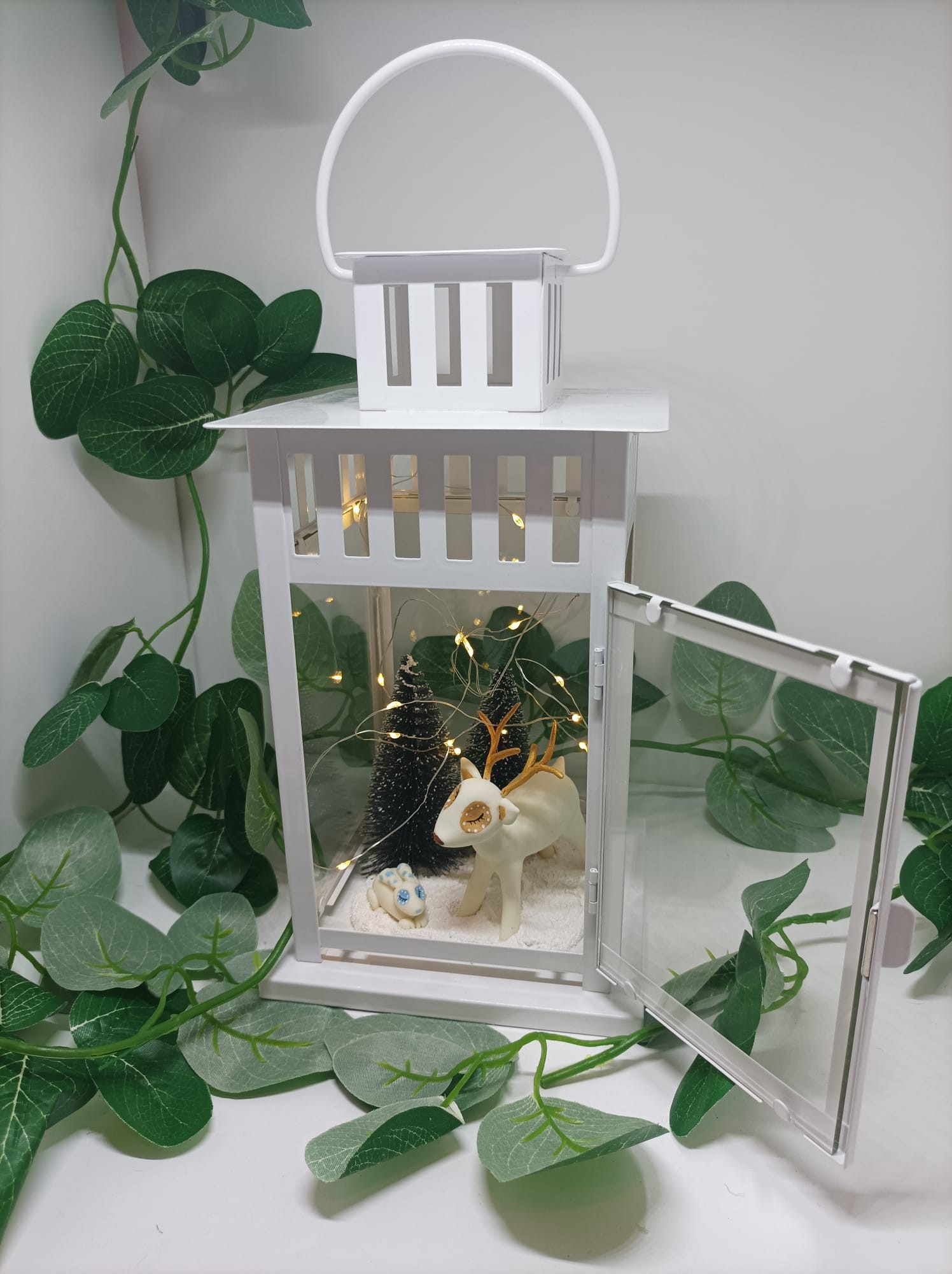 Lanterne blanche avec un cerf et un lapin modelés à la main en porcelaine froide, agrémentée d'une guirlande LED à piles boutons avec un interrupteur.