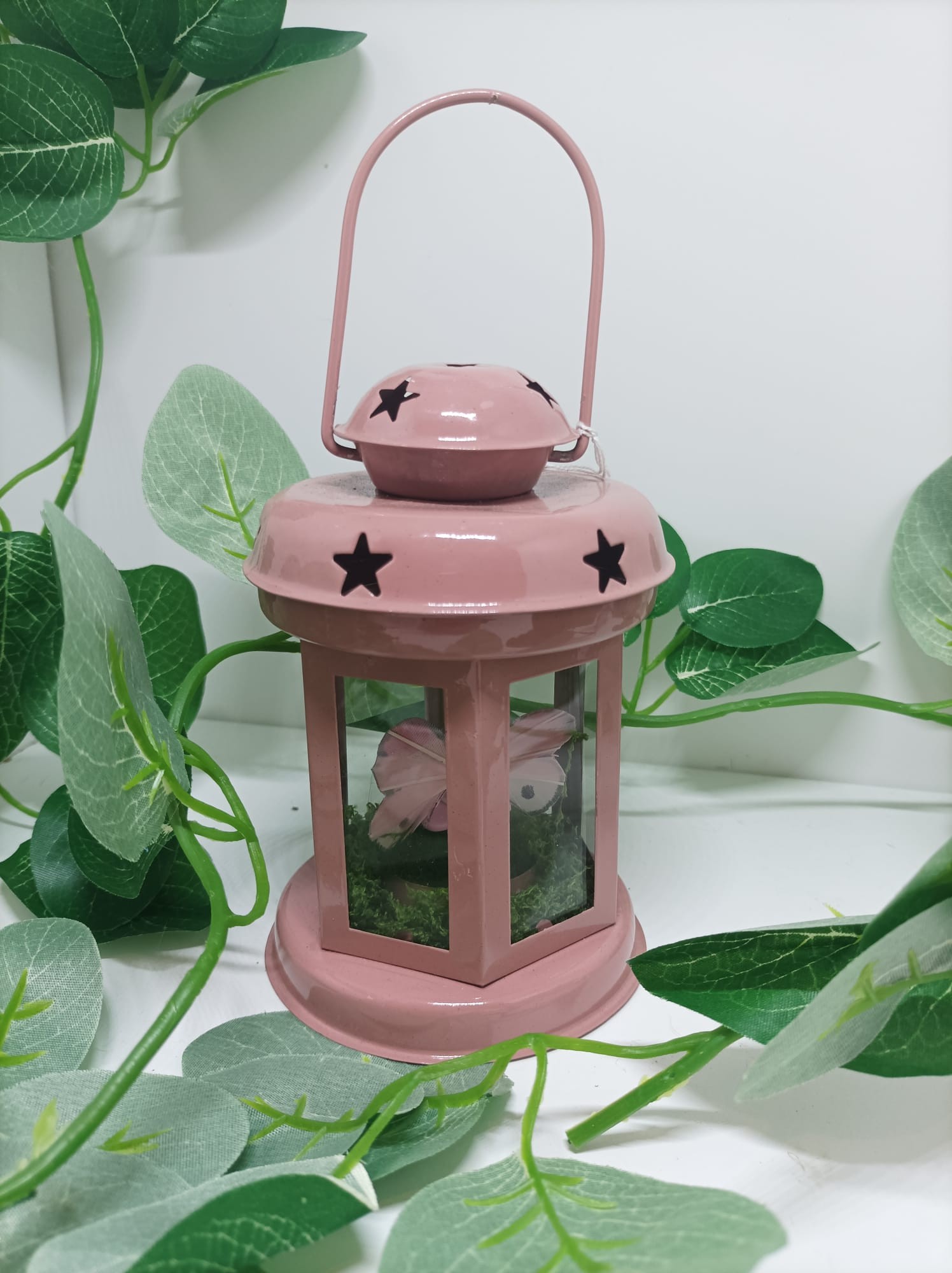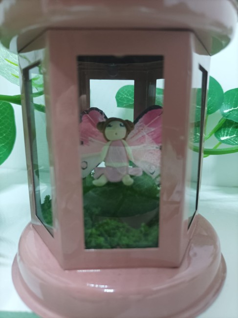 Lanterne rose avec une fée et des fleurs modelées à la main en porcelaine froide.