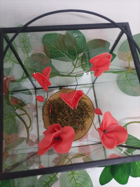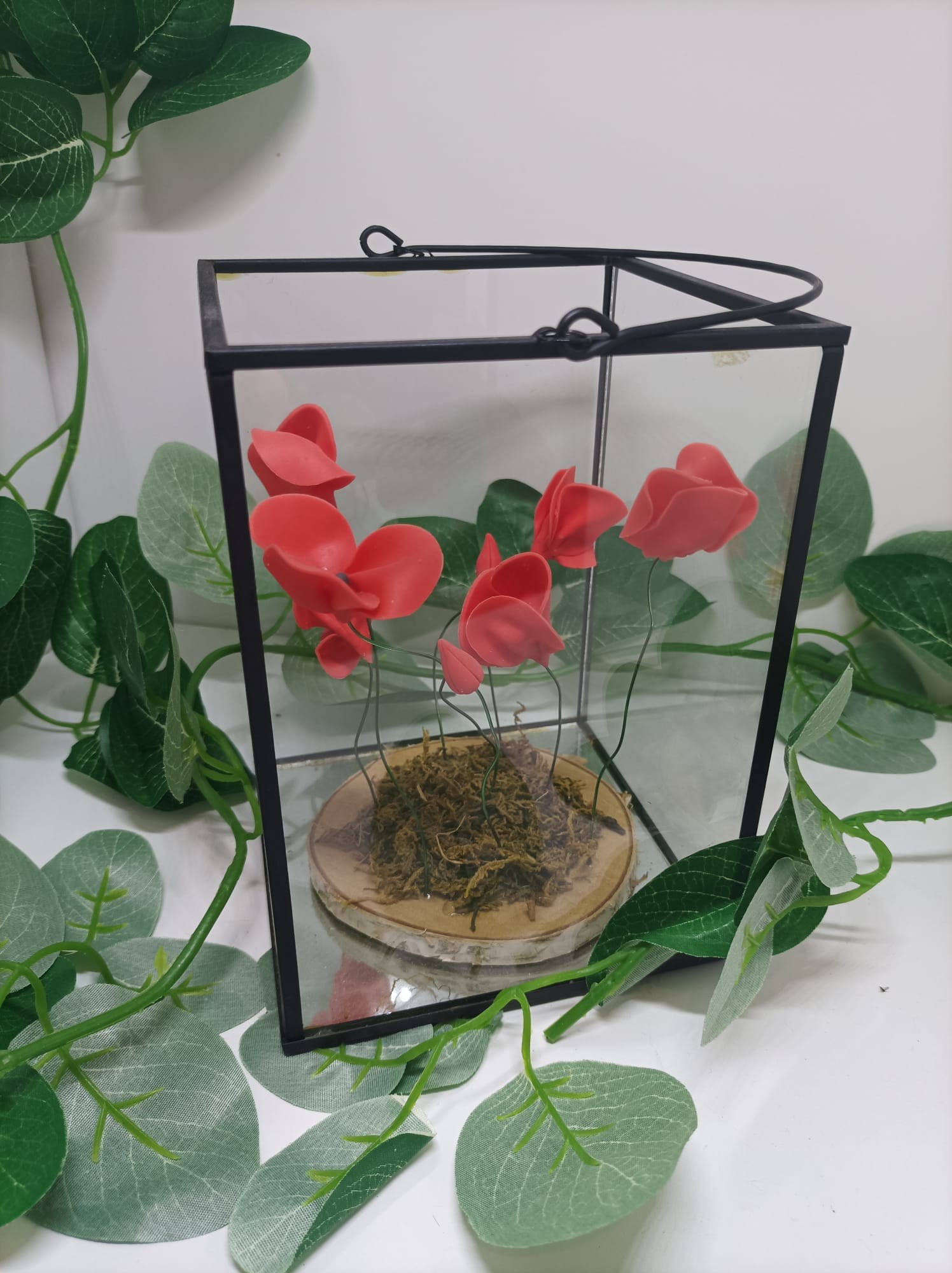 Lanterne noire avec des coquelicots modelés à la main en porcelaine froide. Le fond de la lanterne est un miroir.