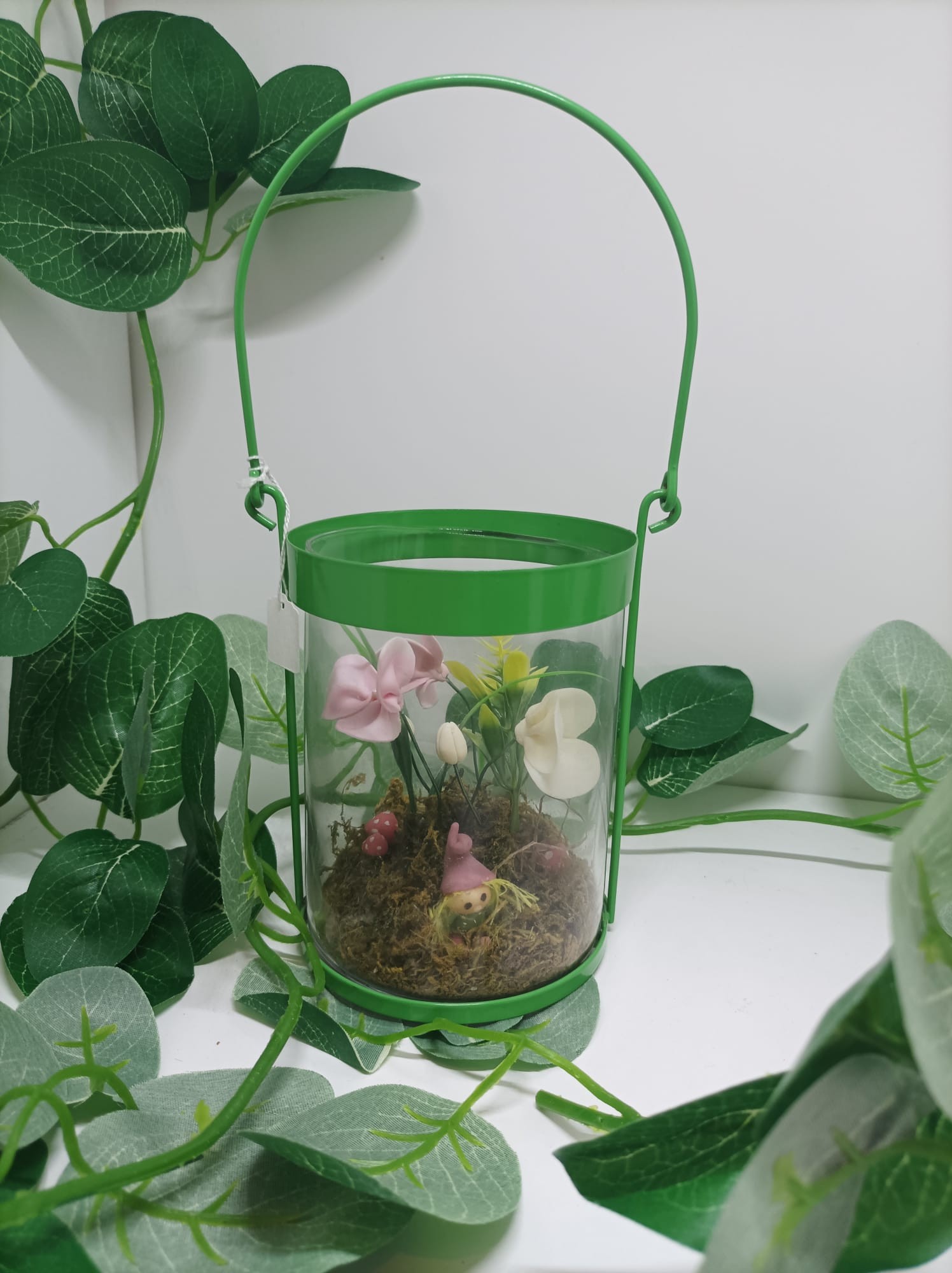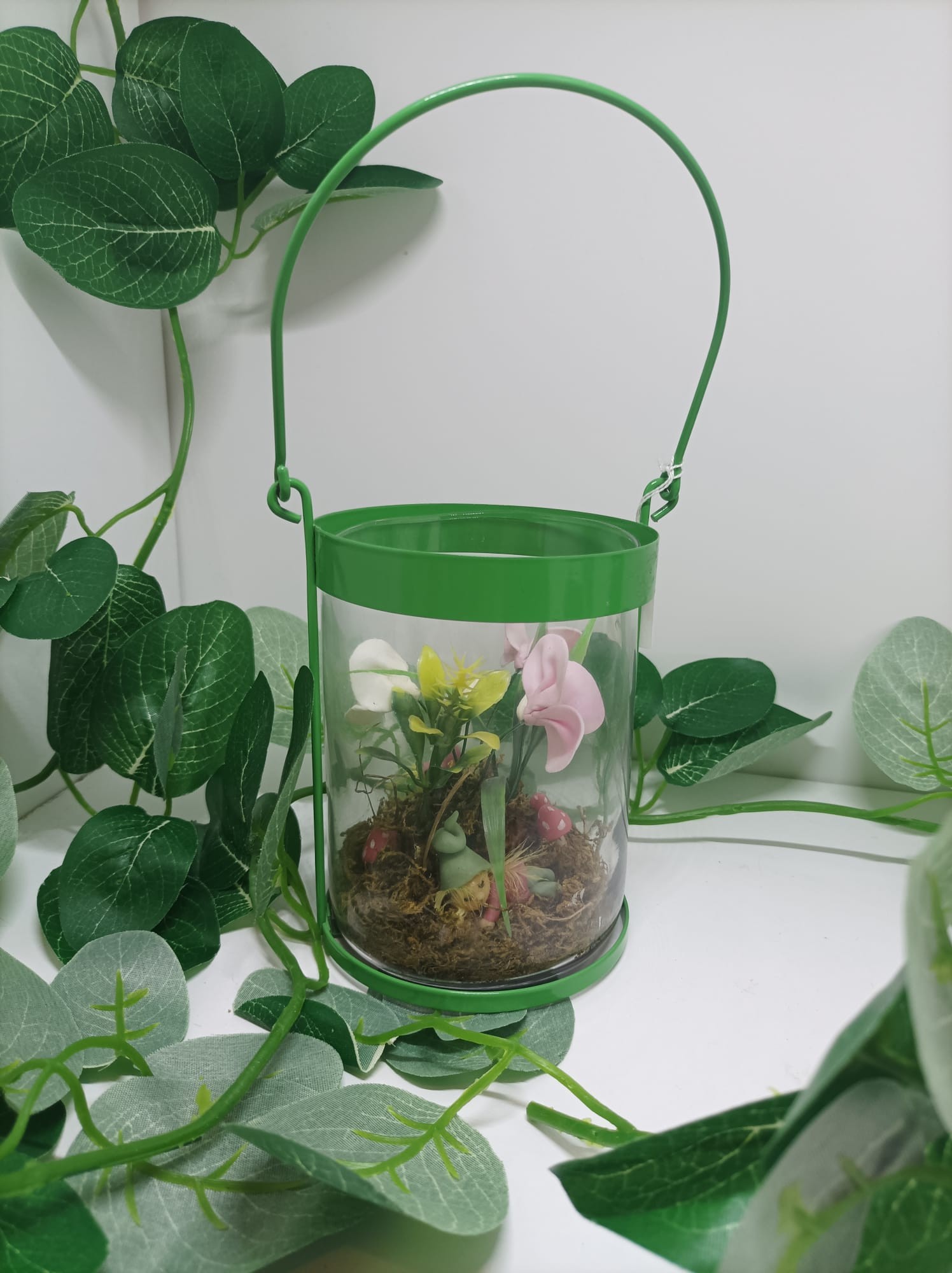 Lanterne verte avec des fleurs artificielles et des lutins modelés à la main en porcelaine froide.