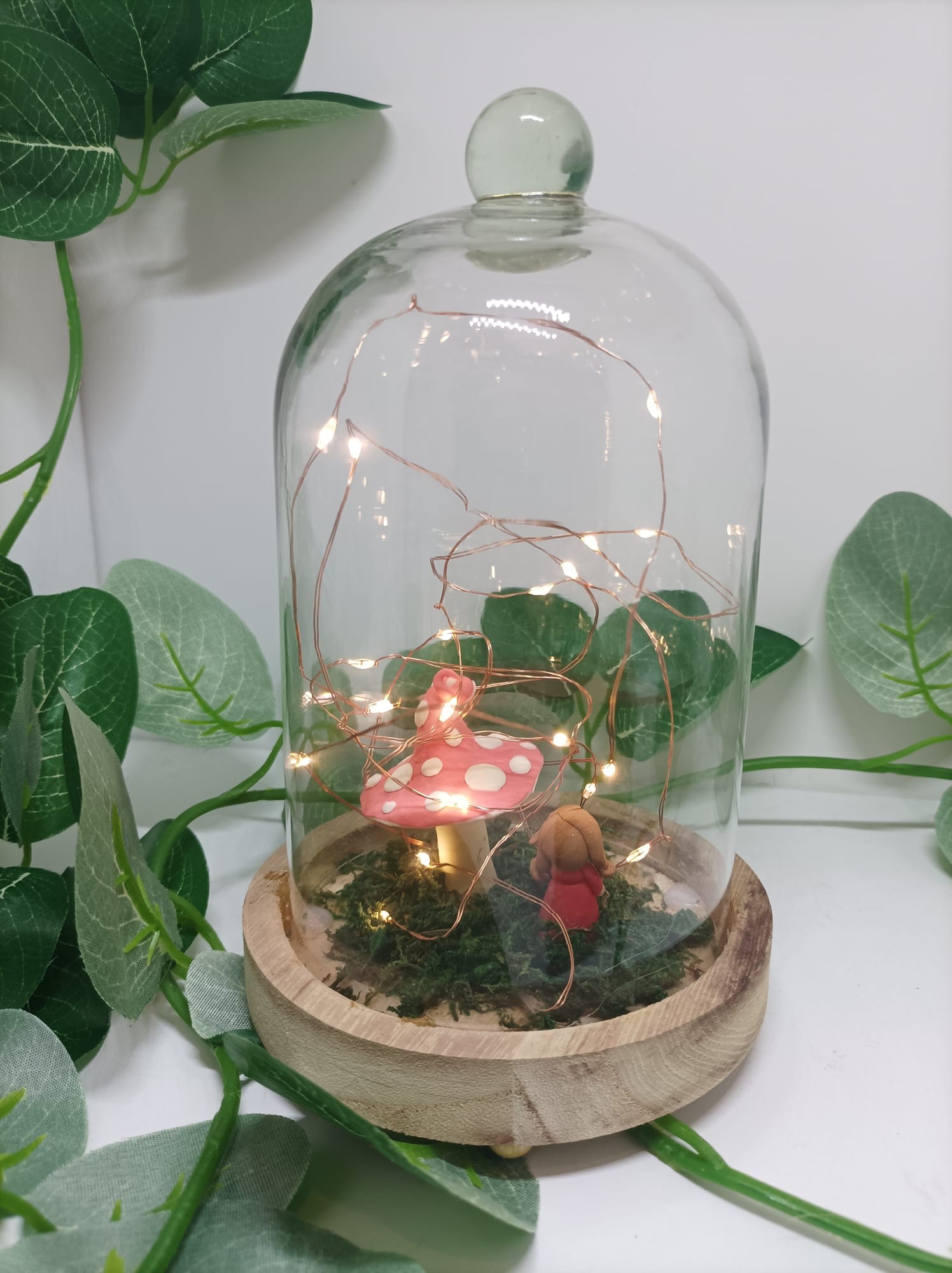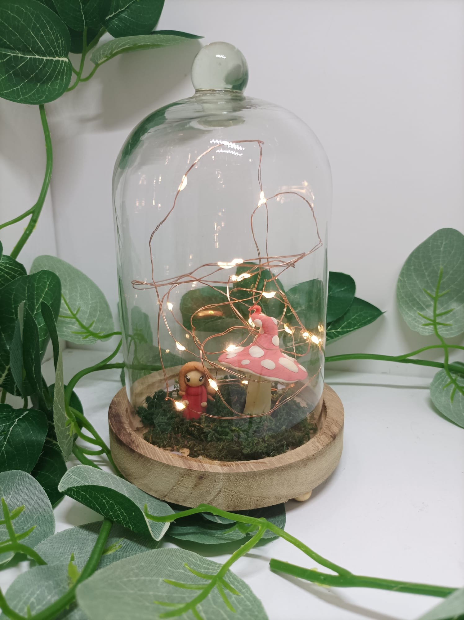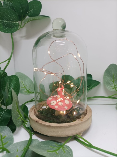 Champignon et une petite fée modelés à la main en porcelaine froide sous cloche avec guirlande LED.