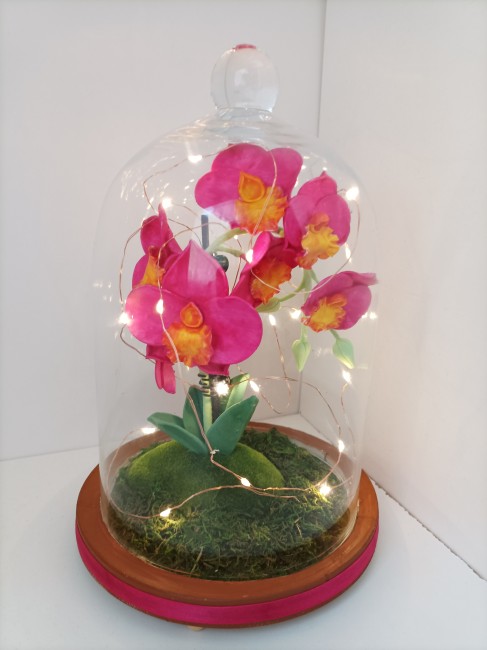 Orchidées modelées en porcelaine froide sous grande cloche en verre avec guirlande Led