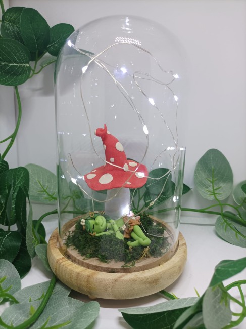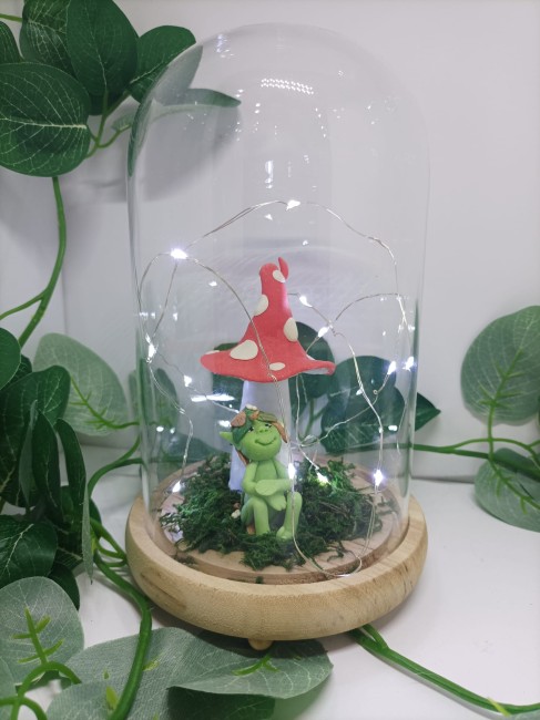 Elfe et son champignon modelé à la main en porcelaine froide sous cloche avec guirlande LED