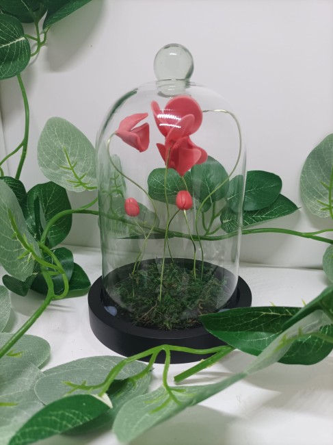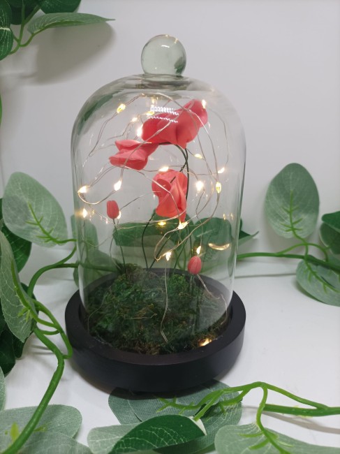 Coquelicots modelés à la main en porcelaine froide sous cloche avec guirlande LED