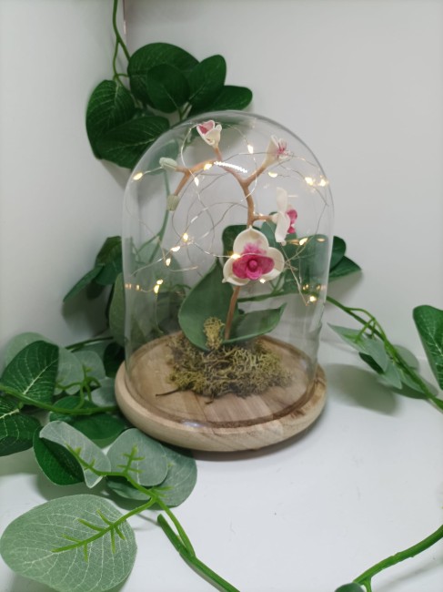 Orchidées modelées à la main en porcelaine froide sous cloche en verre avec guirlande Led