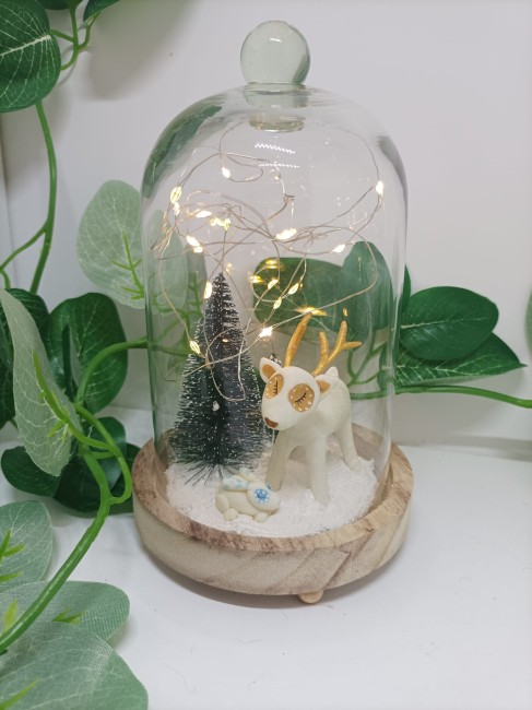 Cerf et lapin modelés à la main en porcelaine froide sous cloche en verre avec guirlande Led